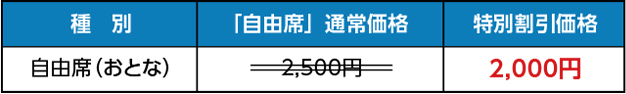 会場入口のチケット売場にて、ご年齢の確認できる書面をご提示のうえ、特別割引の自由席料と共にご希望の席種をご購入ください。