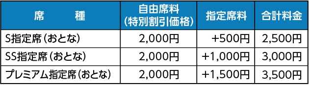 指定席をご希望の場合は、上記の「自由席料(入場料)」の他に、 指定席料が必要となります。